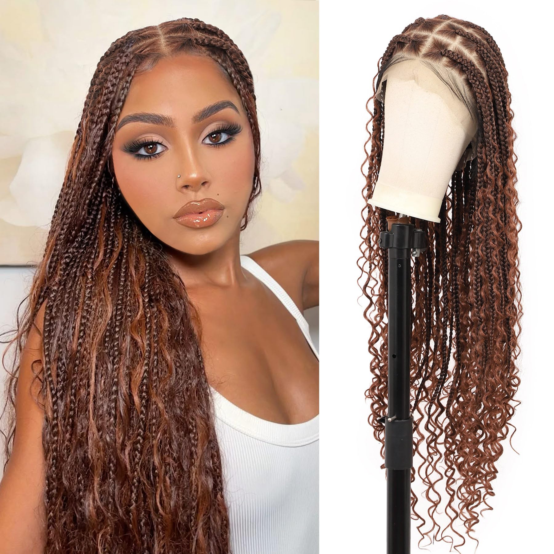 Olymei 360° HD Full Lace Knotless Braided Wigs for Black Women Boho Braided Wigs with Baby Hair Box Braid Wig Premium Synthetic Braid Lace Front Wig with Curly End Brown 36"