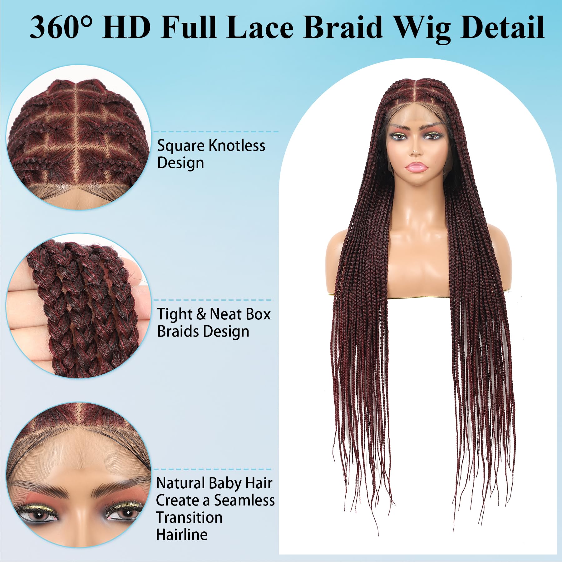 Olymei 360° Hd Full Lace Large Square Knotless Braided Wigs for Women Box Braid Wig with Baby Hair Long Burgundy Premium Synthetic Braided Lace Front Wigs 36"