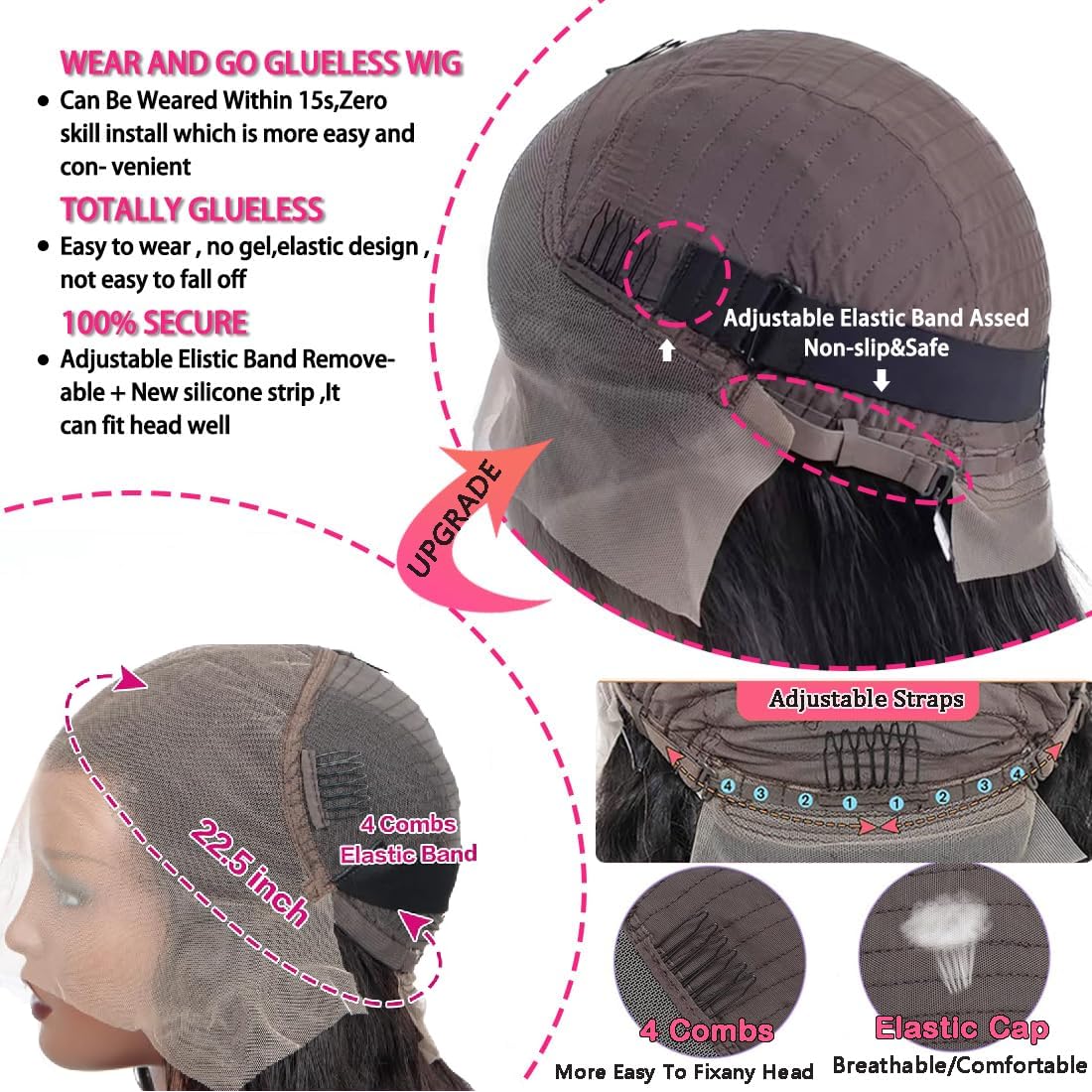 - Glueless Wigs Human Hair Pre Plucked Cap Size:Full Elastic of the Cap, 21.5-22.5 inch Medium Cap has 4 combs, Adjustable Elastic Band to Fix it Very Well. Easy to Install, Wear and Go Glueless Wig, Not Easy to Fall Off, Suitable for More People