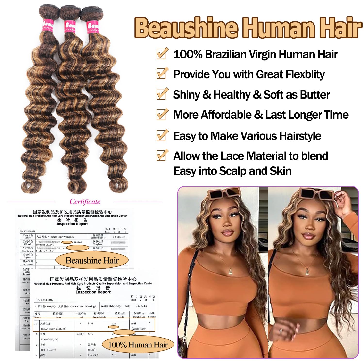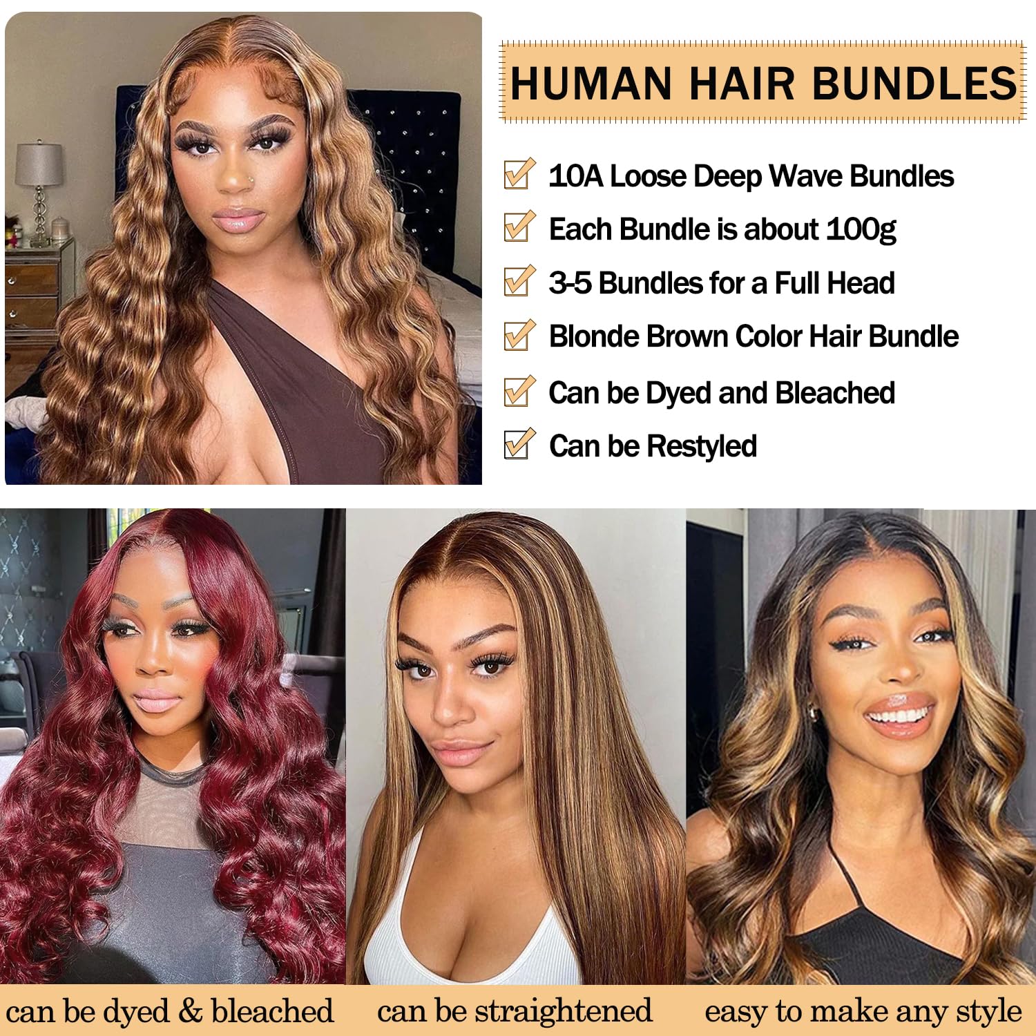 - Bundles with Closure Quality: #4/27 Human Hair Bundles Brown Blonde Loose Deep Wave Bundles Highlighted Bundles Human Hair with Closure, Strong Double Machine Weft, Full & Thick Ends, High Elasticity, One Direction Cuticle With No Split Ends, No Smell,No Shedding & Tangle, Can Be Straightened, Curled, Dyed and Restyled As Your Own Hair