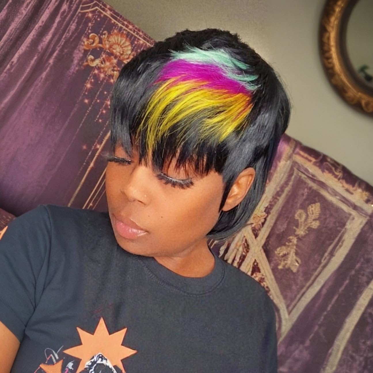 QiaQiaRing Mullet Wigs for Black Women Chic Elegent Mullet Pixie Cut Wigs for Daily Use Short Layered Pixie Bob Human Hair With Bangs Brazilian Virgin Straight Bob Human Hair (1b/purple/blue)
