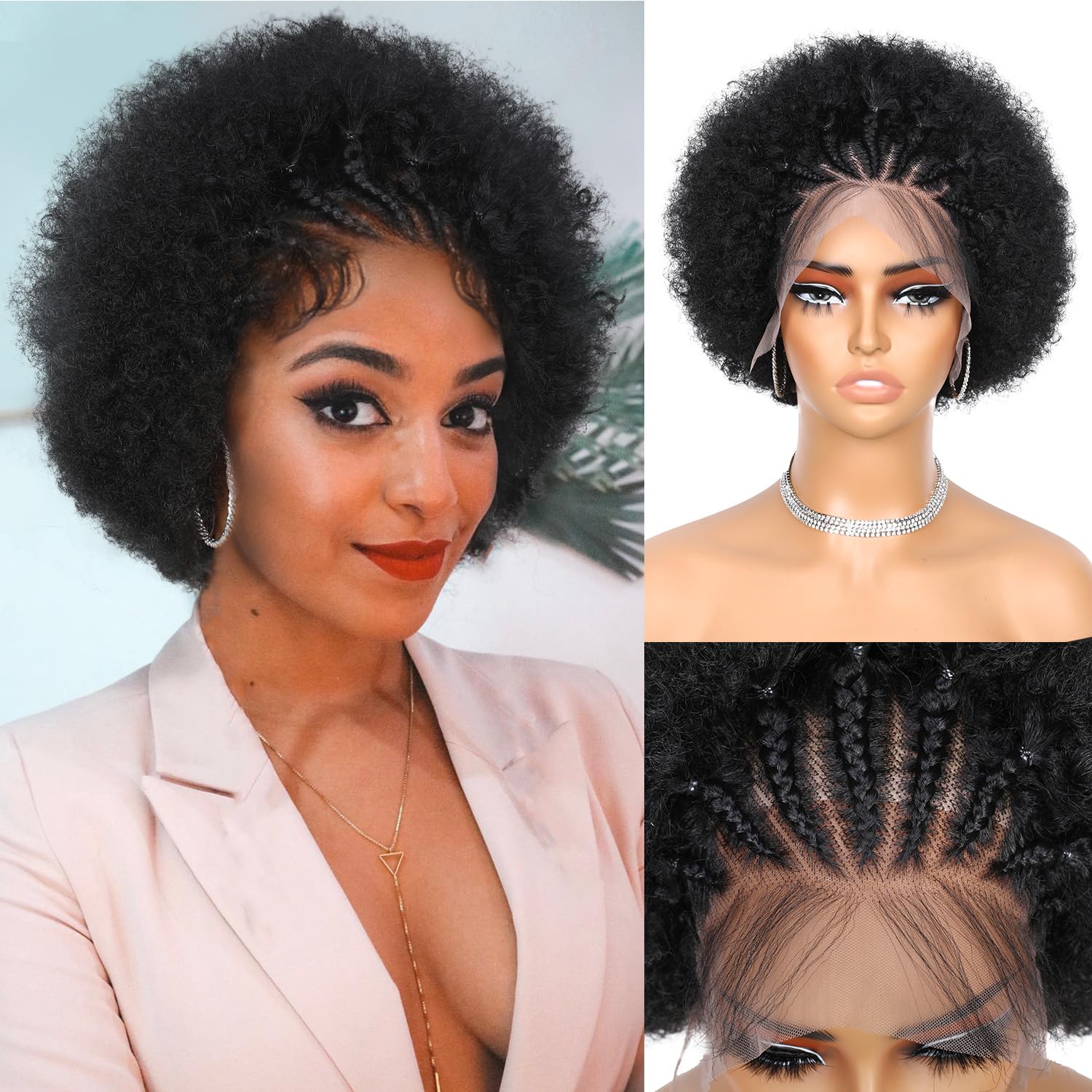 Quantum Love Braided Cornrow Afro Puff Wig for Black Women Stitch Braids Lace Front Wigs with Baby Hair Glueless Prep lucked Afro Braid Synthetic Natural Black Hair