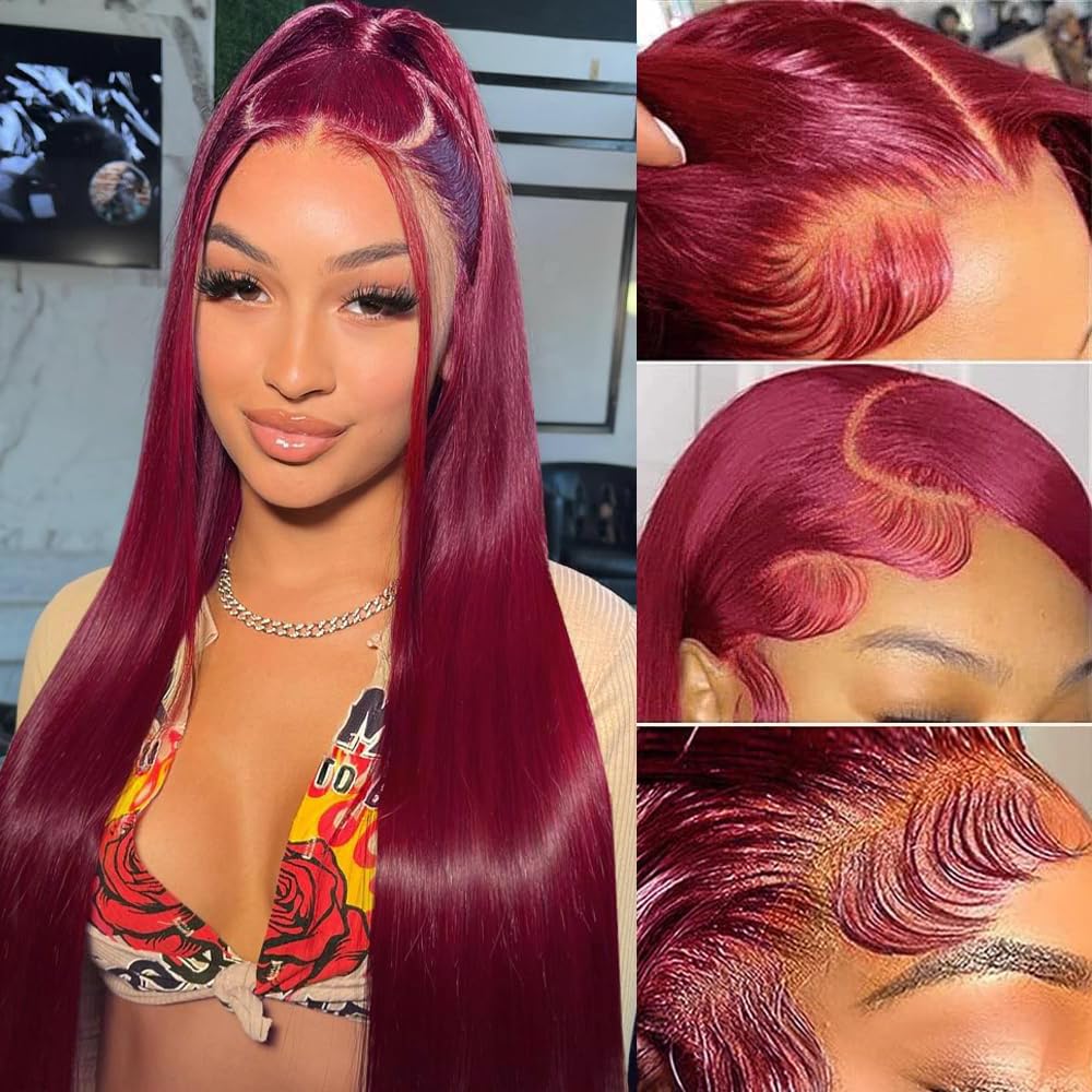 - 【Red Lace Front Wigs Human Hair Quality 】99J Burgundy Straight Lace Front Wig Human Hair, Wine Red Colored, Pre Plucked with Baby Hair, Makes the Hair More Natural, Physical High Temperature Shaping, Does Not Contain Any Chemical Substances, More Comfortable to Wear by Hand Sewing, Does Not Fall Off, No Tangles and No Smell, It Can be Curled and Modified, Hot Dyed.