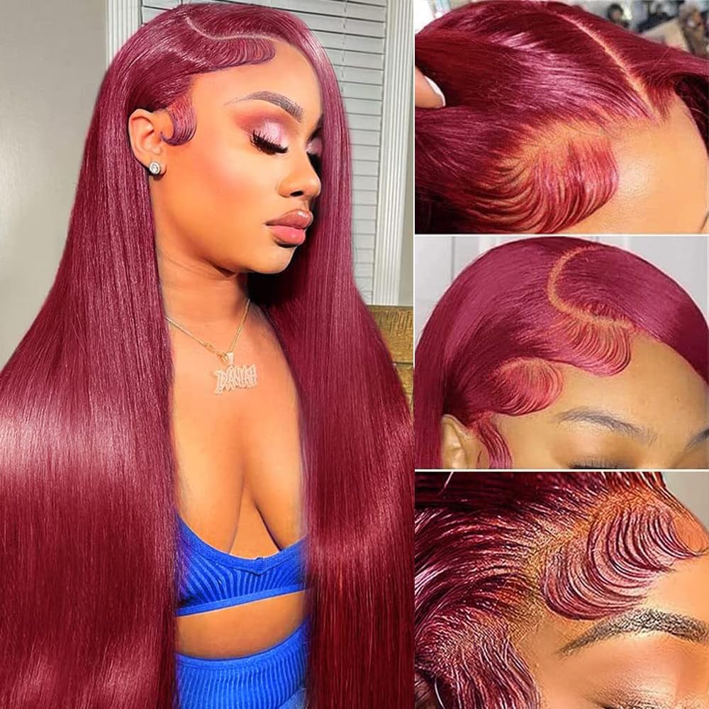 - 【Red Lace Front Wigs Human Hair Quality 】99J Burgundy Straight Lace Front Wig Human Hair, Wine Red Colored, Pre Plucked with Baby Hair, Makes the Hair More Natural, Physical High Temperature Shaping, Does Not Contain Any Chemical Substances, More Comfortable to Wear by Hand Sewing, Does Not Fall Off, No Tangles and No Smell, It Can be Curled and Modified, Hot Dyed.