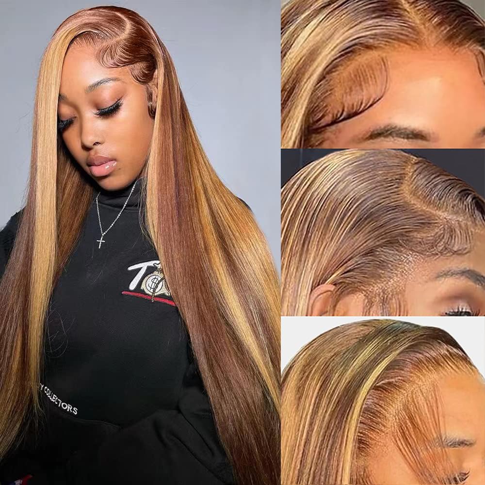 - 【Honey Blonde HD Lace Front Wig Details】P4/27 Highlight HD Transparent Lace Front Wigs Human Hair Pre Plucked with Baby Hair Natural Hairline, Hair Knots are Very Small and Can be Bleached. Wigs Can Be Dyed, Bleached, Premed, and Restyled As You Like
