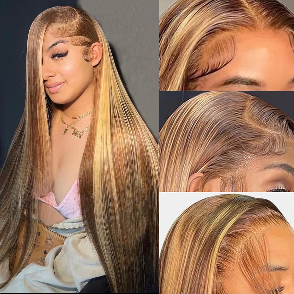- 【Honey Blonde HD Lace Front Wig Details】P4/27 Highlight HD Transparent Lace Front Wigs Human Hair Pre Plucked with Baby Hair Natural Hairline, Hair Knots are Very Small and Can be Bleached. Wigs Can Be Dyed, Bleached, Premed, and Restyled As You Like