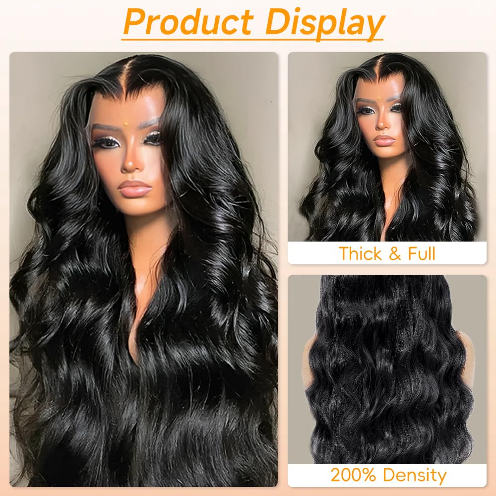 YetFree 30 Inch Body Wave Lace Front Wigs Human Hair Pre Plucked 13x6 HD Lace Frontal Wigs Brazilian Virgin Human Hair 200 Density Glueless Body Wave wig with Baby Hair Natural Black